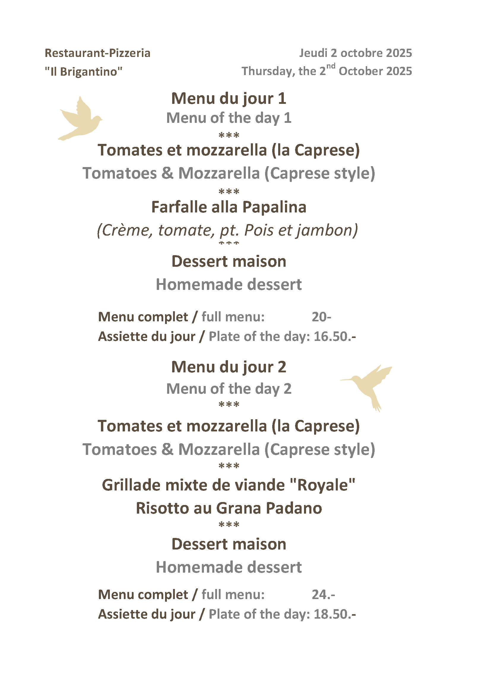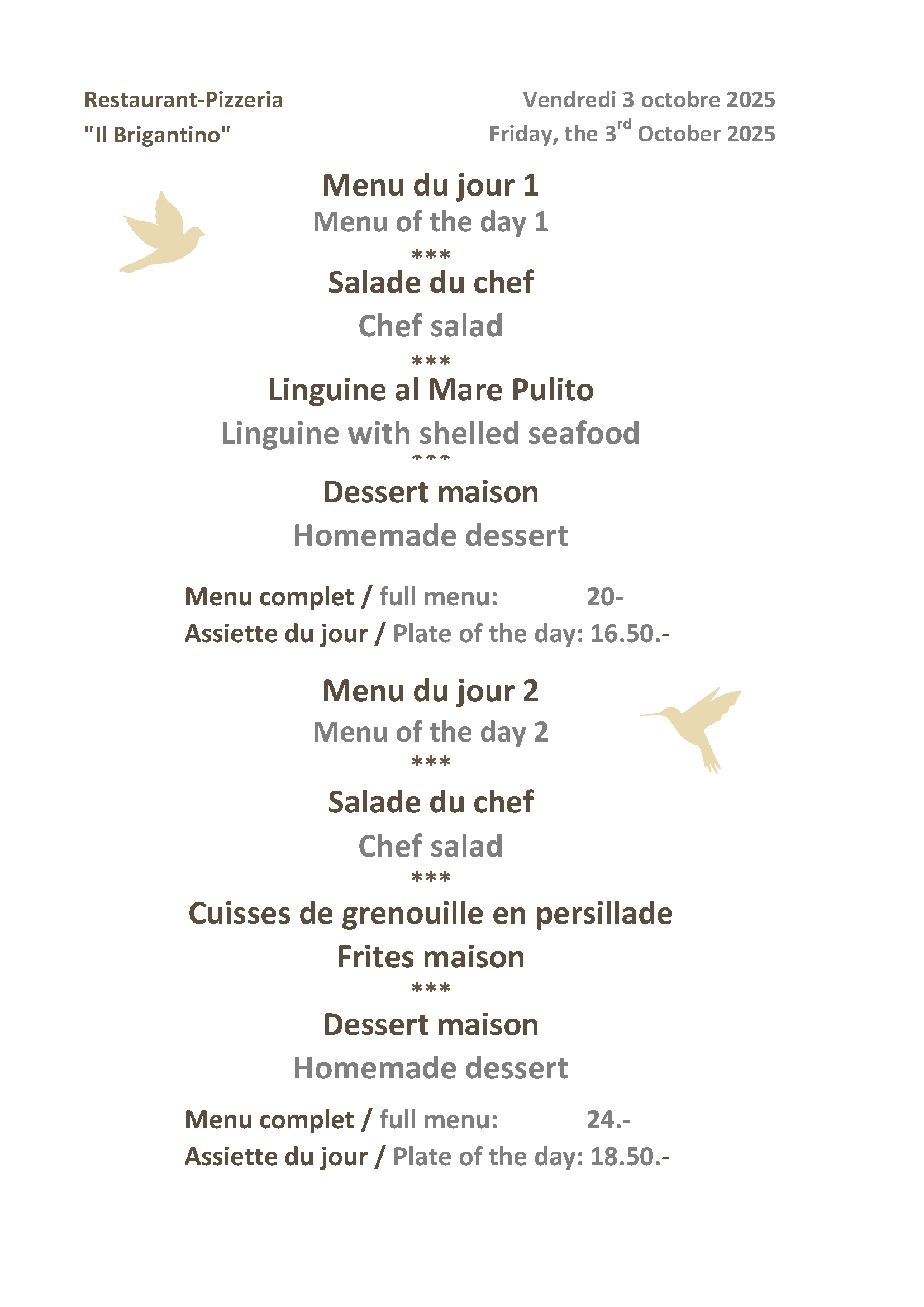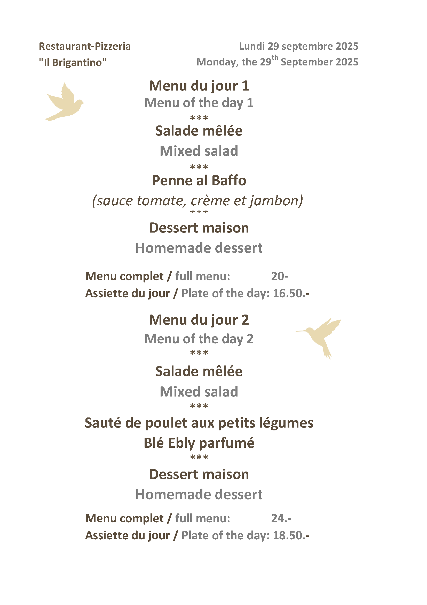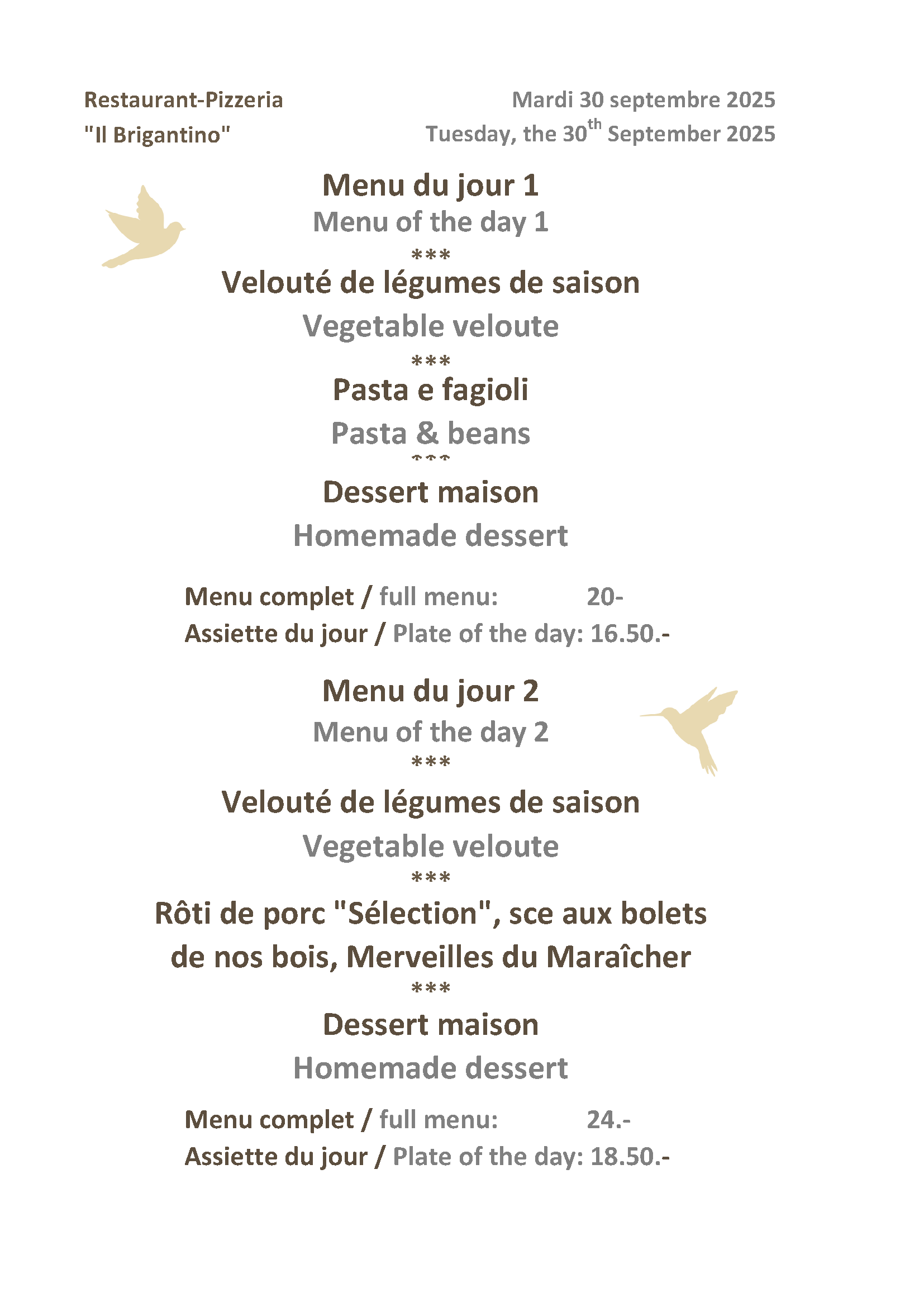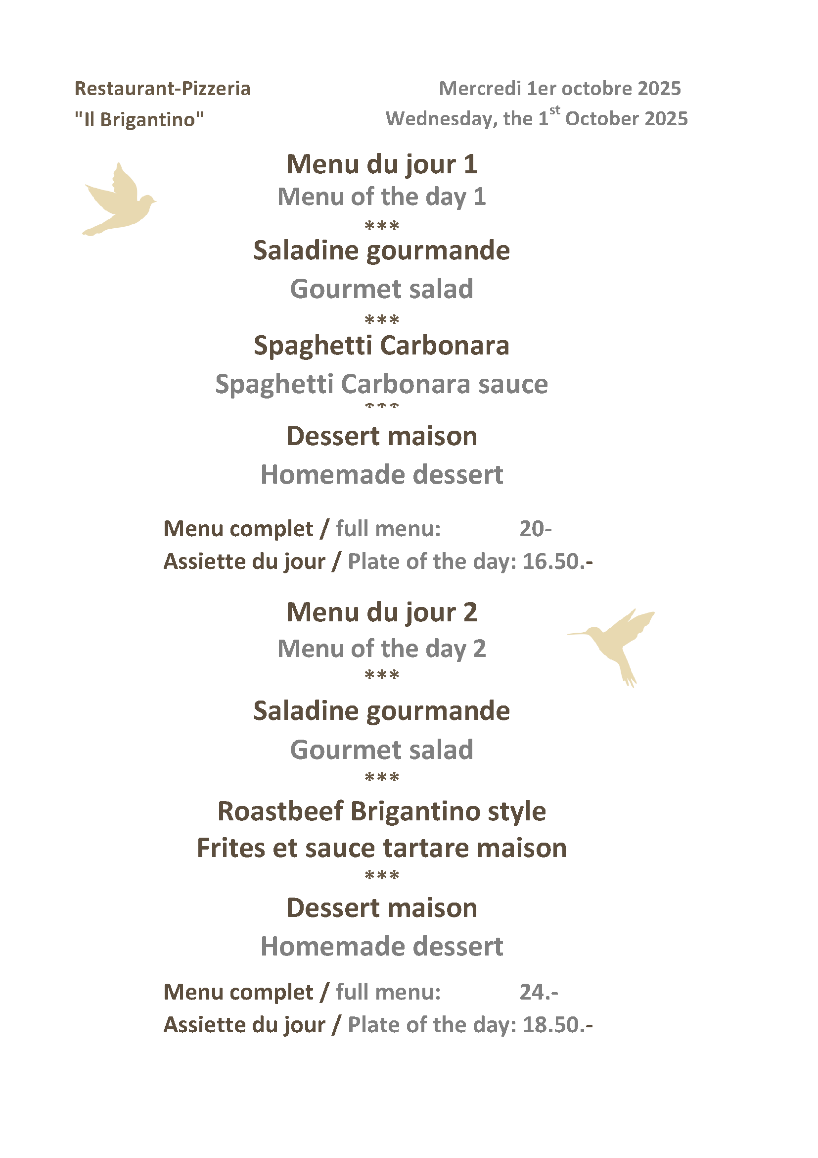 Chaque semaine nous changeons nos menus du jour, choisis et élaborés par le chef en fonction des produits frais de la saison et de sa touche artistique